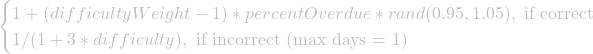 - Anki, Memrise, and others prefer an initial 3 days between due-dates, instead of 6. I’ve adjusted the equations to use that preference.